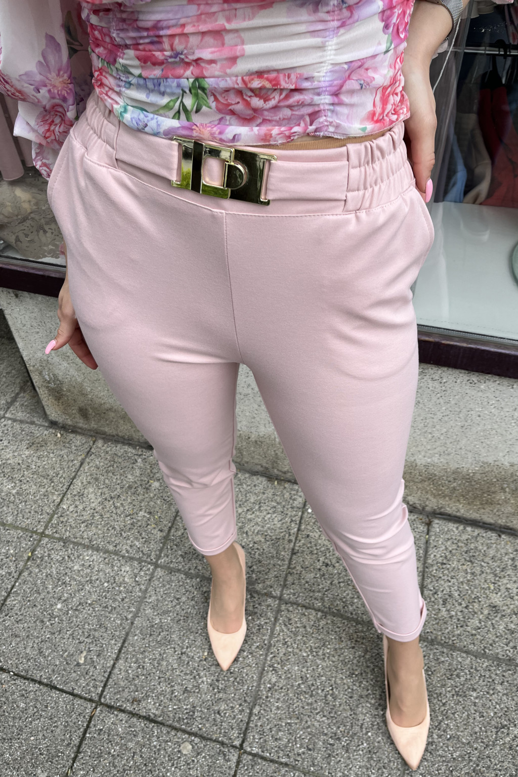 Stílusos, magas derekú fazon, amely tökéletes választás mindennapi viseletre és elegánsabb alkalmakra is. A kényelmes gumis derékrész aranycsatos övvel van kiegészítve, amely nemcsak praktikus, hanem nőies megjelenést is biztosít. Oldalzsebes kialakítása fokozza a funkcionalitást. Finom tapintású, kissé rugalmas anyaga kiváló komfortérzetet nyújt egész napra. A szűkített szárú szabás és a boka fölé érő hossz modern, karcsúsító hatást eredményez. A púder rózsaszín árnyalat lágy, nőies stílust kölcsönöz minden megjelenéshez.