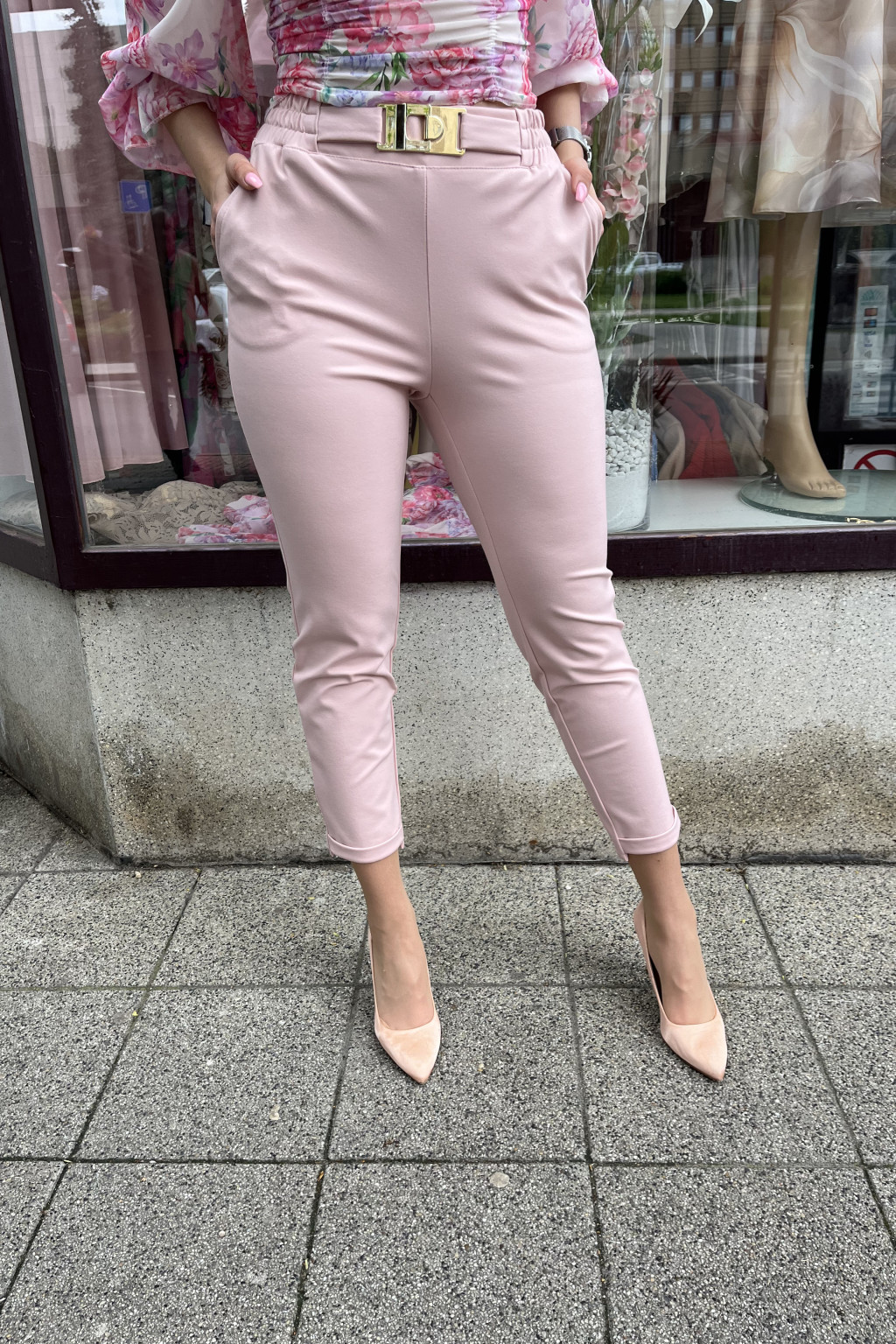 Stílusos, magas derekú fazon, amely tökéletes választás mindennapi viseletre és elegánsabb alkalmakra is. A kényelmes gumis derékrész aranycsatos övvel van kiegészítve, amely nemcsak praktikus, hanem nőies megjelenést is biztosít. Oldalzsebes kialakítása fokozza a funkcionalitást. Finom tapintású, kissé rugalmas anyaga kiváló komfortérzetet nyújt egész napra. A szűkített szárú szabás és a boka fölé érő hossz modern, karcsúsító hatást eredményez. A púder rózsaszín árnyalat lágy, nőies stílust kölcsönöz minden megjelenéshez.